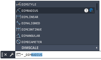 Po rozpoczęciu wpisywania w wierszu polecenia nazwy polecenia lub zmiennej systemowej dostępne opcje są wyświetlane przez funkcję autouzupełniania. Na przykład po wprowadzeniu wymiar wyświetlane są wszystkie polecenia i zmienne systemowe rozpoczynające się od tych liter, tak jak pokazano na rysunku.