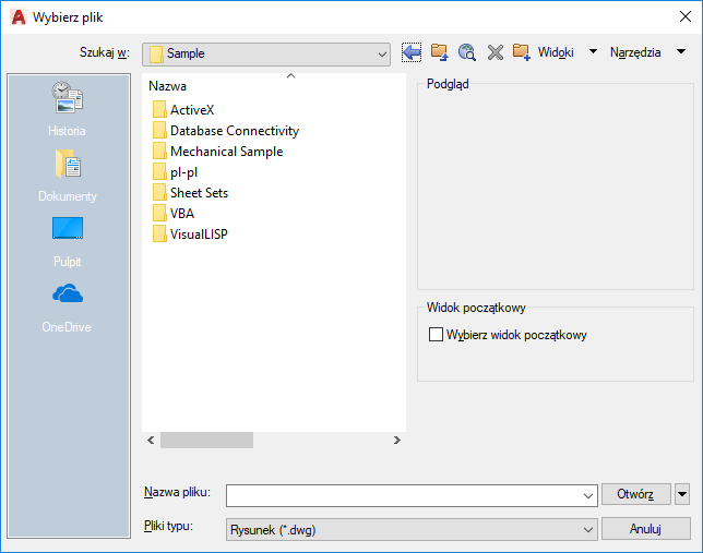 Wyświetla obraz wybranego pliku. Aby zapisać bitmapę podglądu razem z rysunkiem, użyj opcji Zapisz obraz podglądu w oknie dialogowym Opcje na karcie Otwórz i zapisz.