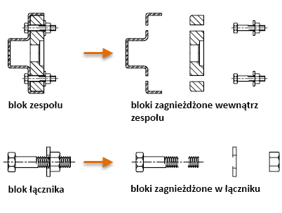 Za pomocą polecenia BLOK można utworzyć kolekcje powiązanych bloków i zapisać je w dedykowanym pliku rysunku nazywanym rysunkiem biblioteki bloków. Bloki te można wstawiać pojedynczo z dowolnego innego rysunku. Po wstawieniu całego pliku rysunku biblioteki bloków do bieżącego rysunku wszystkie jego definicje bloków są automatycznie dodawane do bieżącego rysunku.