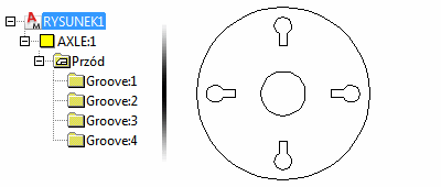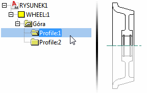 W tym przykładzie folder Profil:1 zawiera górny profil koła. Profil:2 to drugie umieszczenie tego folderu, utworzone przez odbicie folderu Profil:1. Zmiana jednego profilu automatycznie aktualizuje drugi.