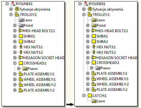 W poniższym przykładzie węzeł komponentu SIDE PLATE DOUBLE kliknięto prawym przyciskiem myszy i przy użyciu menu kontekstowego została utworzona nowa część LATCH. W efekcie część LATCH jest zagnieżdżona pod komponentem SIDE PLATE DOUBLE, który zostaje przekształcony w zespół.