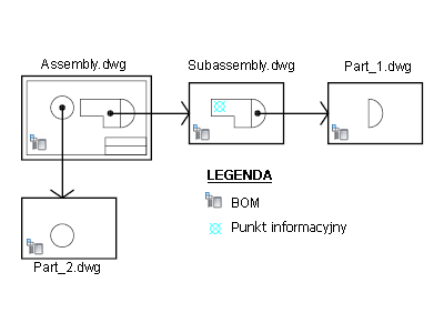Ten proces roboczy związany z dołączaniem odnośnika nie jest ograniczony do scenariusza zespół-część. Można również dołączyć rysunek podzespołu do rysunku zespołu jako odnośnik. W zestawieniu komponentów rysunku zespołu podzespół jest wyświetlany jako element rozwijalny. Po rozwinięciu podzespołu części podzespołu są pokazane poniżej. Za pomocą tej metody można budować hierarchię zespołów i części.