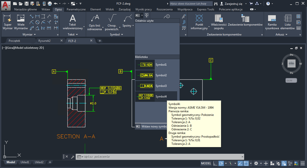 Niektóre biblioteki symboli są dostępne z poziomu wstążki, co ułatwia korzystanie z nich. Podczas wstawiania symbolu bezpośrednio z biblioteki symboli na wstążce w programie AutoCAD Mechanical toolset nie są wyświetlane żadne okna dialogowe.