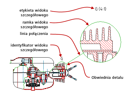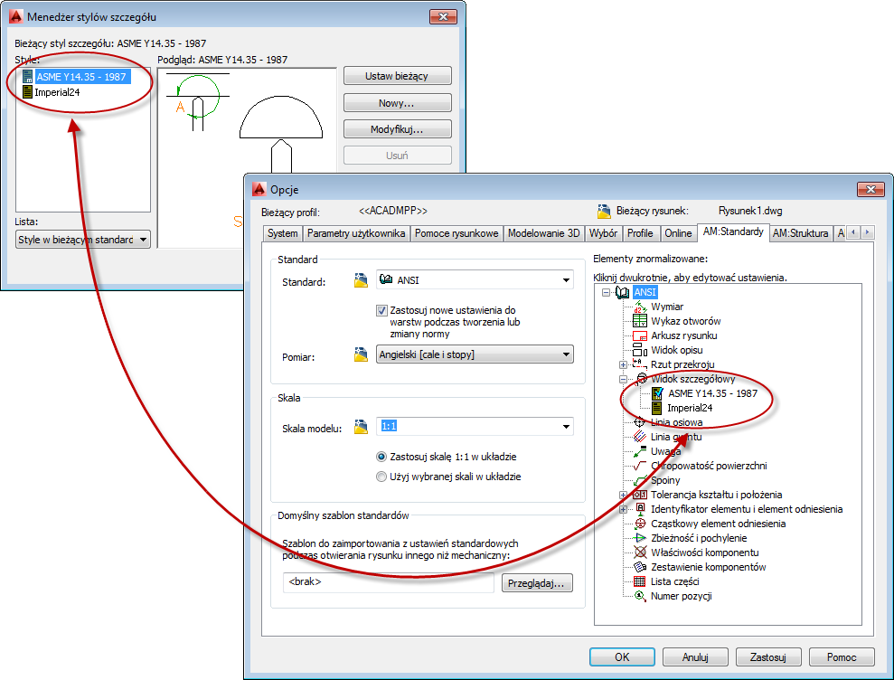 Ustawienia, które określają wygląd obiektów programu AutoCAD Mechanical toolset, są zapisywane w mającym nazwę zbiorze ustawień, czyli w tzw. standardzie rysunkowym. W związku z tym sposób, w jaki style szczegółu stosowane są do obiektów programu AutoCAD (widoków szczegółowych w dokumentacji modelu), jest inny od sposobu, w jaki stosowane są do obiektów programu AutoCAD Mechanical toolset (widoki szczegółowe AMDETAIL). Odpowiednio: