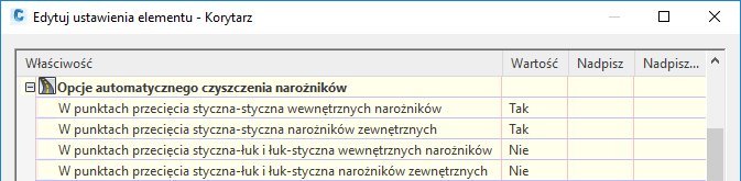 Za pomocą tych opcji można niezależnie kontrolować, czy wewnętrzne i zewnętrzne narożniki korytarzy o stałej szerokości są czyszczone w punktach przecięcia styczna-styczna i styczna-łuk.