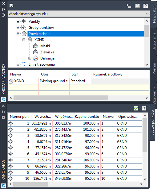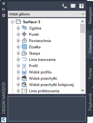 W oknie Obszar narzędzi można wyświetlać maksymalnie cztery karty: Nawigator, Ustawienia, Pomiar i Przybornik. Jeśli w oknie jest aktywny więcej niż jeden widok, w oknie Panorama wyświetlane są karty z nazwami widoków.
