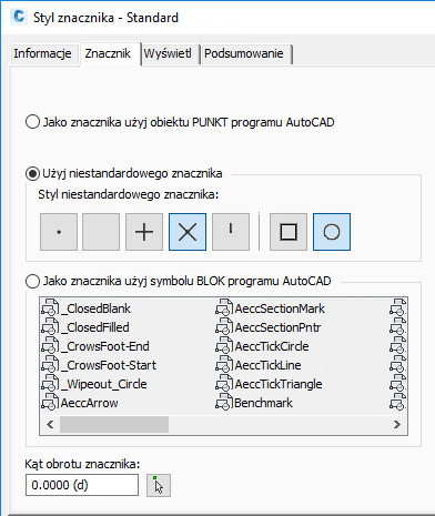 Style znacznika można skonfigurować w taki sposób, aby używać punktów programu AutoCAD, niestandardowych symboli znacznika lub bloków.