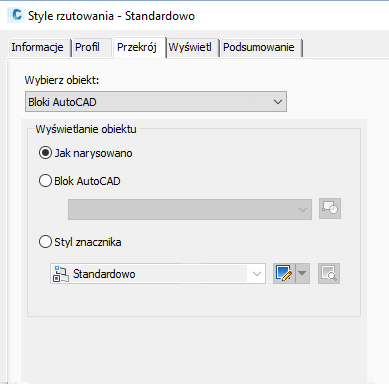 Obiekty rzutowane w widokach przekroju wykorzystują następujące style: