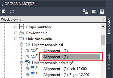 Linie trasowania osi jezdni w drzewie Nawigatora. To polecenie umożliwia szybkie znalezienie położenia przecinającej się linii trasowania w drzewie Nawigatora.