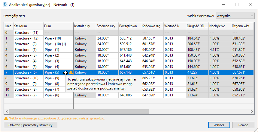 Po wybraniu wiersza w tabeli wyników w prawym panelu są wyświetlane szczegółowe informacje o rurze i strukturze w wybranej linii.
