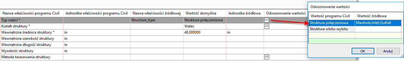 Jeśli chcesz przenieść włazy, wloty i wyloty jako typy części Połączenie, możesz skonfigurować odwzorowanie wartości dla typu części. Przykładowo, jeśli wartości atrybutów Właz, Wlotu i Wylot zostały określone w danych ArcGIS, aby wskazywać typ struktury, można wprowadzić te wartości w oknie dialogowym Odwzorowanie wartości.