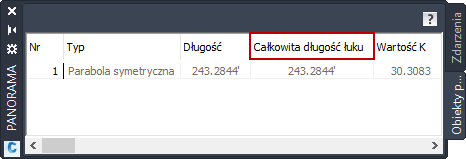 Wartość Całkowita długość łuku pokazuje całkowitą długość łuku pionowego, natomiast właściwość Długość pokazuje długość obliczonego fragmentu geometrii łuku, na przykład, gdy styczne są dołączone wzdłuż łuku.