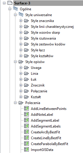 Obiekty Rury i Powierzchnia współużytkują te same style renderingu w grupie Style uniwersalne, natomiast Korytarze i Profilowanie współużytkują inne style z tego samego folderu.
