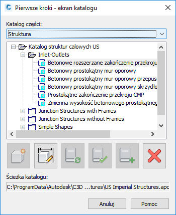 W oknie dialogowym można wybrać do dalszej pracy katalog rur albo katalog struktur i nawigować po kategoriach w ramach wybranego katalogu.