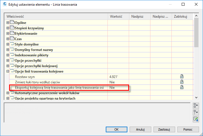 Aby uzyskać więcej informacji, zobacz temat Okno dialogowe dotyczące linii trasowania — Edytuj ustawienia elementu.