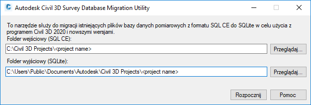 Można użyć narzędzia Autodesk Civil 3D Survey Database Migration Utility do przekonwertowania baz danych pomiarowych z formatu SQL CE na SQLite.