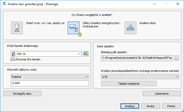 - Analiza wlotu: Umożliwia przeanalizowanie wydajności wlotów i wygenerowanie raportu na temat przepływu, głębokości i zasięgu przy każdym wlocie.
