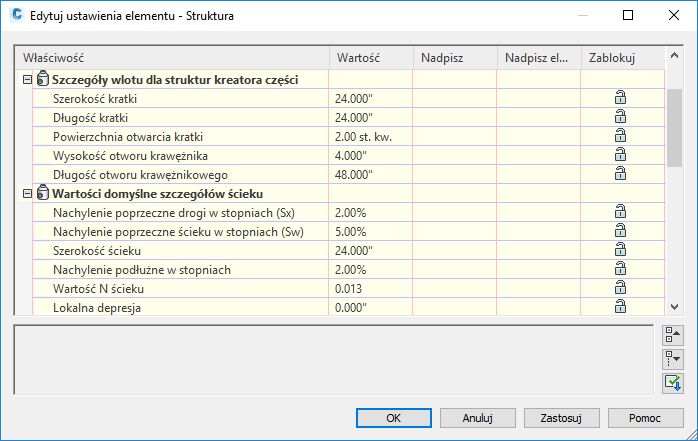 - Przypisanie właściwości strukturom, które mogą być wykorzystane przez polecenie Analiza sieci grawitacyjnej do analizy drenażu. Aby uzyskać więcej informacji, zobacz temat Karta Właściwości części (okno dialogowe Właściwości struktury).