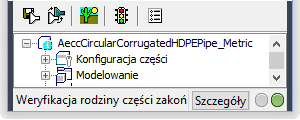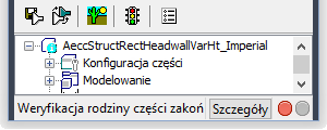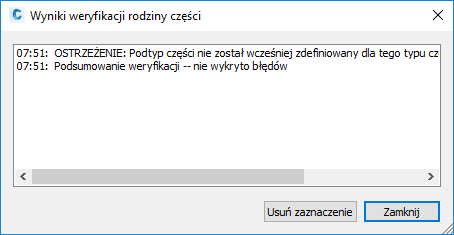 Jeśli w modelu występują błędy na pasku stanu pojawi się komunikat informujący o niepowodzeniu sprawdzania części i zostanie otwarte okno dialogowe z listą błędów. Należy zapoznać się z błędami, wprowadzić niezbędne modyfikacje i powtarzać czynności aż do uzyskania pomyślnego wyniku sprawdzania.