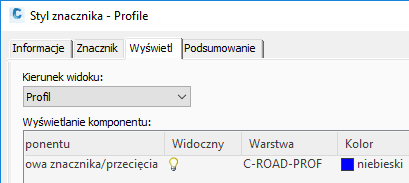 Style znaczników służą do sterowania wyglądem obiektów przecinających w widokach profili. Wyglądem stylu znacznika można sterować na karcie Wyświetlanie okna dialogowego Styl znacznika. Wybierz profil z listy Kierunek widoku, aby przejrzeć i edytować konfigurację stylu znacznika dla widoku profilu. Istnieje pojedynczy komponent, który umożliwia sterowanie wyświetlaniem zarówno znacznika (który służy do wyświetlania przecinających profili, linii charakterystycznych, figur pomiarowych i polilinii 3D), jak i linii pionowej przecięcia (która służy do wyświetlania linii trasowania przecięcia).