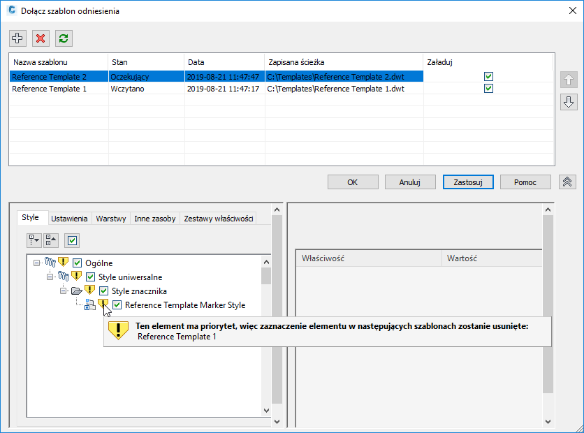 Po kliknięciu przycisku Zastosuj lub OK style i ustawienia są stosowane, duplikaty są usuwane z szablonów o niższym priorytecie, a alerty są usuwane.