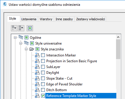 Zaznacz pola wyboru dla stylów i ustawień, do których mają domyślnie istnieć odniesienia. W poniższym przykładzie wybrano styl znacznika szablonu odniesienia.