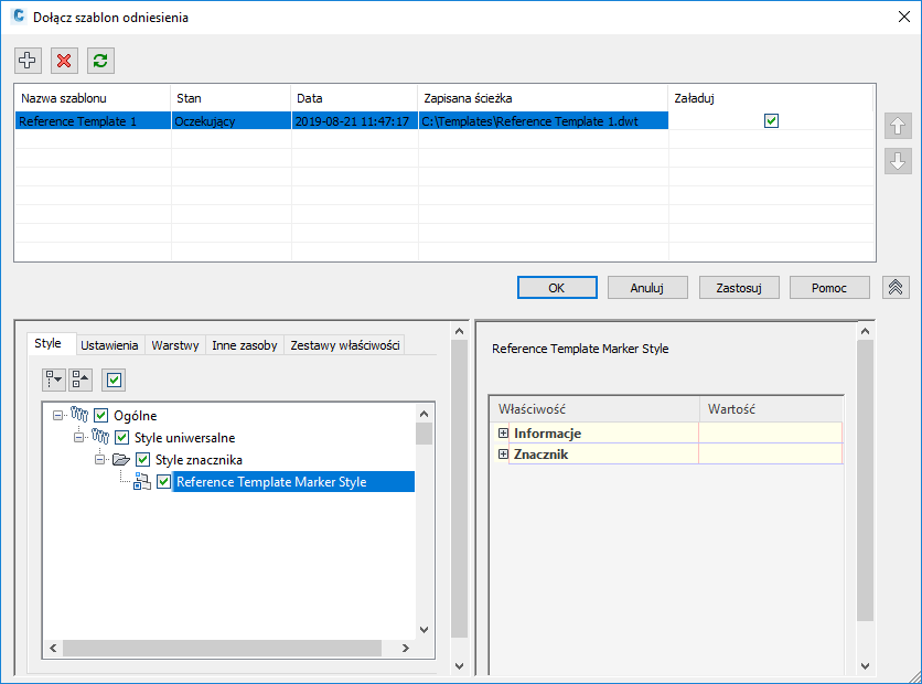 Uwaga: Po wyczyszczeniu pola wyboru Załaduj i kliknięciu przycisku Zastosuj lub OK, nieużywane komponenty z szablonu odniesienia zostaną usunięte z rysunku, a rysunek nie będzie aktualizowany o dalsze zmiany wprowadzone do szablonu odniesienia. Komponenty, które zostały użyte, takie jak warstwy, pozostaną na rysunku.