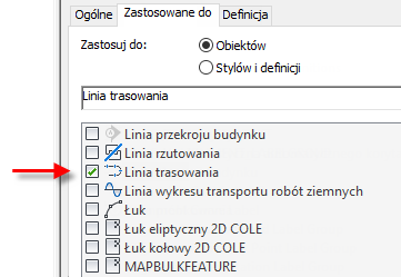W przypadku większości typów etykiet, na karcie Zastosowane do Menedżera stylów, wybierz typ obiektu, który chcesz opatrzyć etykietą, a nie powiązaną etykietę obiektu (wyjątki opisano poniżej). Przykładowo, aby oznaczyć linie trasowania danymi właściwości, wybierz linię trasowania podczas ustawiania zestawu właściwości.