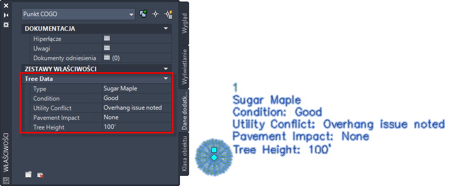 Poniższa ilustracja przedstawia punkt oznaczony danymi drzewa ustawionymi w zestawie właściwości.