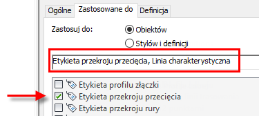 Aby dołączyć dane zestawu właściwości w stylach etykiet przecięć, należy wybrać typ obiektu Etykieta przekroju przecięcia oprócz typu obiektu, którego położenie przecięcia pokazane jest w widoku przekroju.