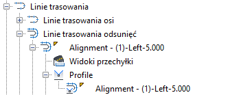 Linie trasowania odsunięcia są dodawane do kolekcji Linie trasowania odsunięcia w Nawigatorze. Profile odsunięcia są tworzone w kolekcji Profile wewnątrz nazwanej kolekcji linii trasowania odsunięcia.