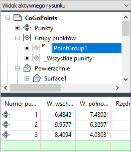 Punkty COGO są tworzone na rysunku i dodawane do grupy punktów, natomiast powierzchnia jest tworzona na podstawie grupy punktów.