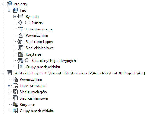 Rysunek przedstawia kolekcje projektu Vault o nazwie Trio oraz projekt skrótu do danych o nazwie Arc. Oba typy projektów są utworzone z domyślnego szablonu projektu. W rezultacie zawierają one identyczne kolekcje powierzchni, linii trasowania i innych obiektów, które mogą być dołączane jako odniesienia do wielu rysunków.