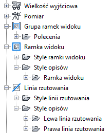 Na poniższym rysunku pokazano kolekcje ramek widoku i linii rzutowania w drzewie Ustawienia: