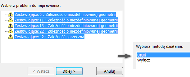 W programie Doktor projektu można teraz wybrać wiele niepoprawnych wiązań i usunąć lub wyłączyć je.