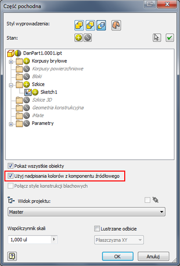 Jest dostępna nowa opcja Użyj nadpisania koloru z komponentu źródłowego do okien dialogowych Zespół pochodny, Część pochodna, Utwórz część i Utwórz komponent. To pole wyboru po zaznaczeniu wstawia wygląd części oraz kolor bryły, elementu lub powierzchni z części pochodnej do nowej. Jeśli ta opcja nie jest zaznaczona, wygląd jest ustawiany jako domyślny.