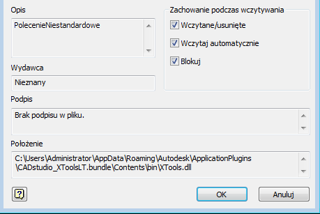 Podczas wczytywania dodatku produktu innej firmy niż Autodesk zostanie wyświetlone nowe okno dialogowe. Teraz można wybrać, czy zezwolić na wczytanie dodatku czy go zablokować. To ustawienie jest zachowywane w kolejnych sesjach. Za pomocą Menedżera dodatków można sprawdzić i zmienić ustawienia zezwolenia/blokowania.