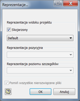 Użyj nowego okna dialogowego Reprezentacje, aby zmienić bieżący widok projektu i zespolenie. Aby uzyskać dostęp do tego nowego okna dialogowego, kliknij prawym przyciskiem myszy węzeł Rozbicie w przeglądarce modelu w prezentacji i wybierz opcję Reprezentacje.