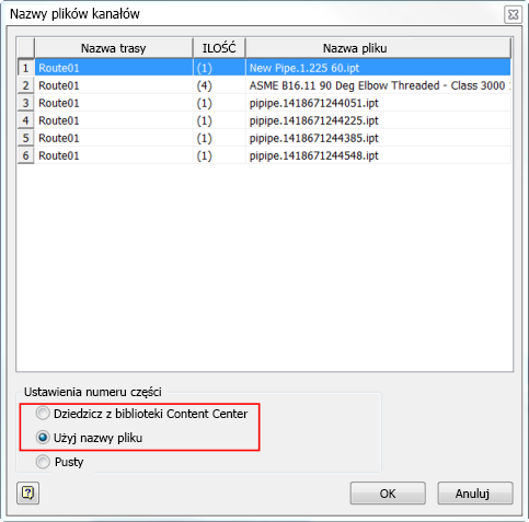 Wyświetl monit o nazwy plików łączników (wstawianie zawartości jako niestandardowa): po wybraniu tej opcji można dostosować nazwę elementów złącznych w oknie dialogowym Nazwy plików rur.
