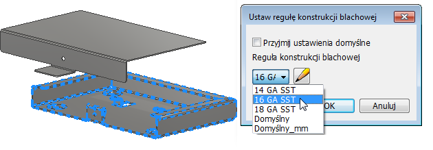 Wielobryłowe konstrukcje blachowe obsługują teraz unikatowe reguły i grubości dla każdej bryły. Reguły dotyczące części wielobryłowych można stosować do brył w przeglądarce lub podczas tworzenia nowych brył w oknie dialogowym Powierzchnia, Kształt kołnierza, Profilowanie rolkowe i Kołnierz wyciągnięty.