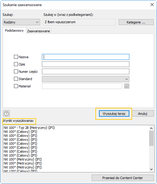 Ponadto przycisk Wyszukaj teraz jest włączany automatycznie w momencie uzyskania dostępu do okna dialogowego Wyszukiwanie zaawansowane. Można wykonać szybkie wyszukiwanie, naciskając klawisz ENTER po określeniu kryteriów wyszukiwania. W polu Wynik wyszukiwania wyświetlane są informacje związane z aktywnym wyszukiwaniem.