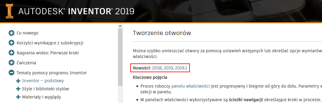 Ponadto w przypadku użycia klawisza F1 w celu przejścia do strony pomocy, gdy ma to zastosowanie, u góry strony widać łącza do tematu Nowości z wyjaśnieniem zmiany w funkcji lub poleceniu.