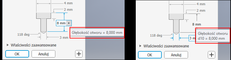 W przypadku polecenia Otwór, gdy wartość jest niepoprawna, na przykład określona długość gwintu jest większa od głębokości otworu, kolor wartości zmieni się na czerwony, a etykieta narzędzi informuje, że wartość jest niepoprawna, podczas jej wprowadzania. Umożliwia to natychmiastowe poprawienie wartości lub zlokalizowanie innej wartości, która wymaga edycji, aby ta wartość stała się właściwa. Gdy wartość jest poprawna, kolor wartości będzie czarny.