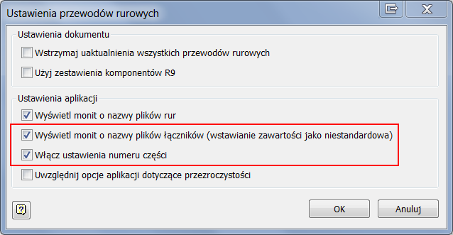Aktualizacje opcji okna dialogowego przewodów rurowych:
