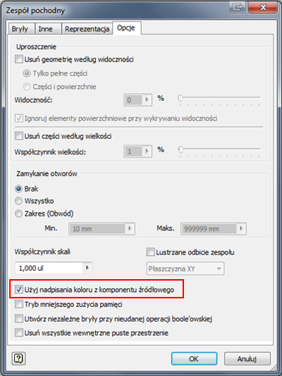 Jest dostępna nowa opcja Użyj nadpisania koloru z komponentu źródłowego do okien dialogowych Zespół pochodny, Część pochodna, Utwórz część i Utwórz komponent. To pole wyboru po zaznaczeniu wstawia wygląd części oraz kolor bryły, elementu lub powierzchni z części pochodnej do nowej. Jeśli ta opcja nie jest zaznaczona, wygląd jest ustawiany jako domyślny.