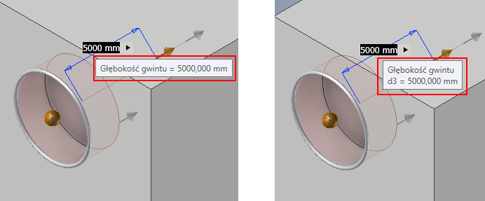 W przypadku polecenia Otwór, gdy wartość jest niepoprawna, na przykład określona długość gwintu jest większa od głębokości otworu, kolor wartości zmieni się na czerwony, a etykieta narzędzi informuje, że wartość jest niepoprawna, podczas jej wprowadzania. Umożliwia to natychmiastowe poprawienie wartości lub zlokalizowanie innej wartości, która wymaga edycji, aby ta wartość stała się właściwa. Gdy wartość jest poprawna, kolor wartości będzie czarny.