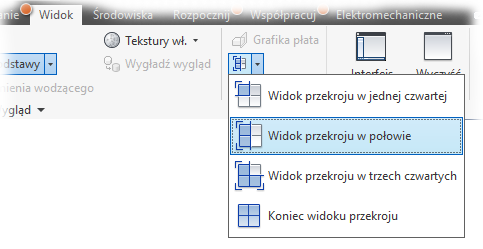 Podczas instalowania programu Inventor można wyrazić zgodę na gromadzenie danych. Na podstawie wprowadzonych przez użytkownika danych dotyczących użytkowania programu Inventor polecenie Widok przekroju w połowie jest najczęściej używane w przypadku modeli części i zespołów. W związku z tym w tej aktualizacji polecenie Widok przekroju domyślnie jest ustawiane jako Widok przekroju w połowie w przypadku pierwszego użycia w sesji programu Inventor. Dziękujemy za pomoc w doborze właściwego ustawienia tego narzędzia. Dostęp do polecenia Widok przekroju można uzyskać z kart Widok i Opisz w dokumentach części i zespołów.