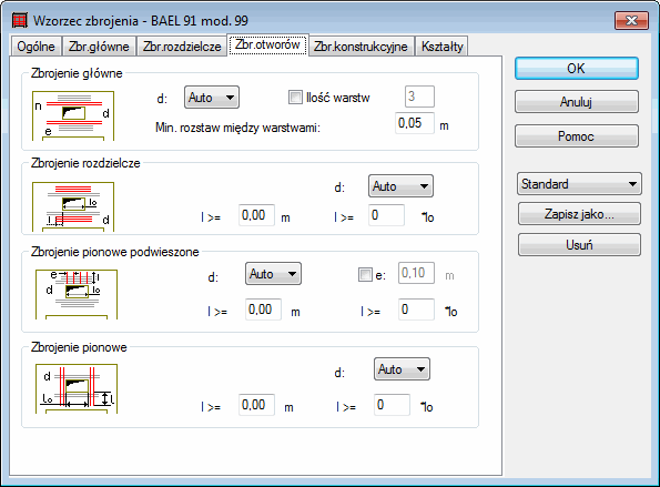 W oknie dialogowym Parametry zbrojenia wybierz kartę Zbrojenie otworów, aby określić sposób doboru zbrojenia otworów traktowanych jako otwory obliczane.