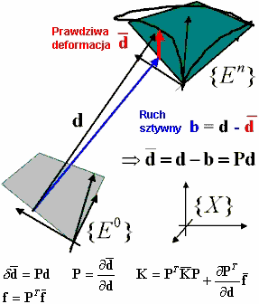 Od całkowitej deformacji elementu odejmuje się tą jej część, która jest związana z ruchem sztywnym (nie generuje odkształceń ani naprężeń). Naprężenia oraz wynikające z nich siły elementowe wyznacza się dla ‘prawdziwej’ części deformacji.
