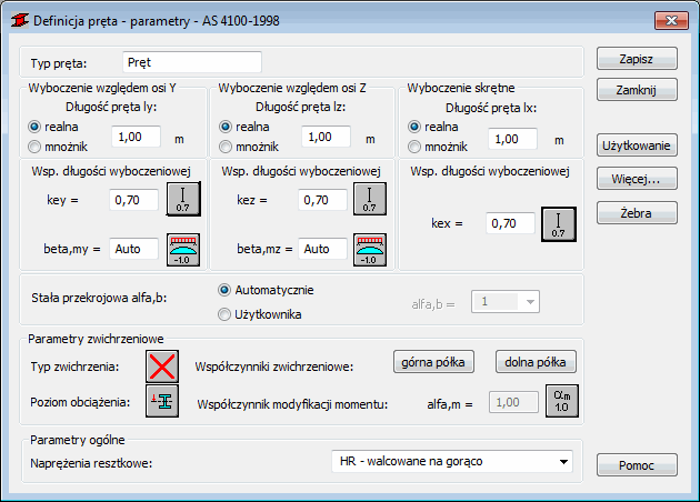 Pole Współczynnik długości wyboczenia jest używane do określania współczynników długości wyboczenia pręta w kierunku x, y i z (key, kez i kex — wyboczenie skręcające). W odpowiednie pola wpisywana jest automatycznie rzeczywista długość pręta (ew. suma długości prętów składowych). Dla wyboczenia skręcającego, używana jest długość jest używany określona w sekcji 8.4.4.1 normy.